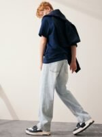 Achieve a cool and relaxed look with this navy blue T-shirt paired with light-wash denim jeans. Crafted from high-quality fabric, the T-shirt offers ultimate comfort, while the loose-fit jeans provide a trendy and laid-back vibe. Perfect for casual outings, school days, or weekend adventures. Pair with sneakers for an effortlessly stylish outfit.